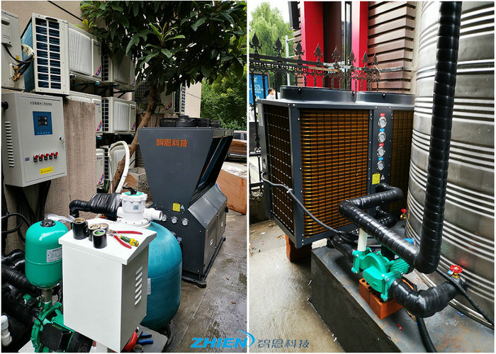 杭州全季酒店足浴、洗浴熱水工程采用智恩空氣能熱泵商用熱水系統(tǒng):浴池循環(huán)熱水系統(tǒng)(空氣能熱泵浴池循環(huán)機(jī)+熱水循環(huán)泵)、空氣能熱泵洗浴熱水系統(tǒng)(空氣能熱泵熱水機(jī)+變頻增壓泵+保溫水箱)