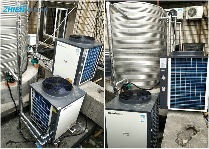 紹興酒店客房熱水項(xiàng)目采用了智恩空氣能2臺(tái)5匹機(jī)器( ZN-KFDX-050ll),5噸圓形不銹鋼保溫水箱。