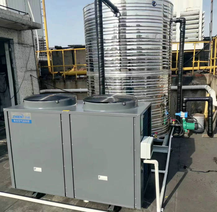 上海飛輪有色金屬有限公司的工廠熱水工程采用了智恩空氣能熱泵10P機(jī)+5噸水圓柱型不銹鋼保溫水箱。