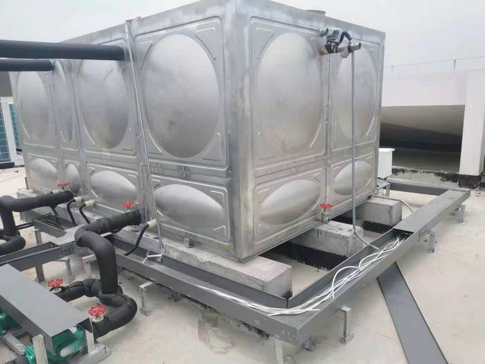 蘭溪黨??諝饽軣崴こ蹋褐嵌鲀膳_(tái)空氣能10匹兩臺(tái)(ZN-KFDX-100ll)+不銹鋼方形保溫水箱10噸一個(gè)。