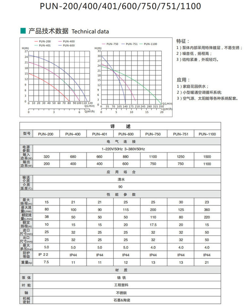 應(yīng)用:1)家庭花園供水; 2)小型暖通空調(diào)循環(huán)系統(tǒng);3)空氣源、太陽能等各種系統(tǒng)配套