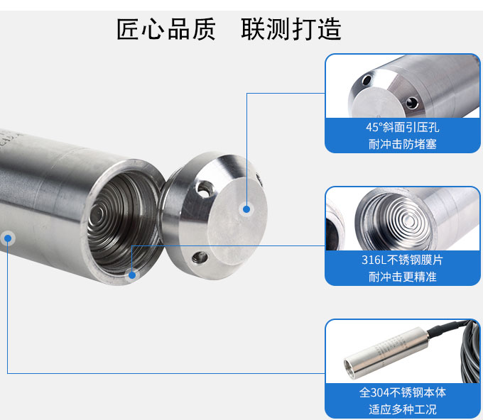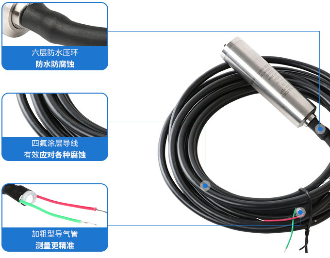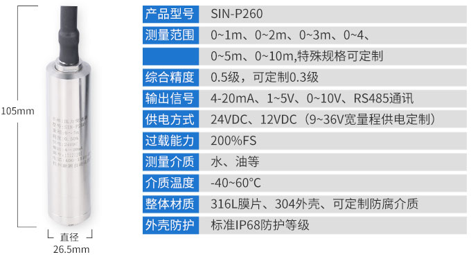 SIN-P260投入式液位變送器SIN-P260投入式液位變送器由高性能擴散硅壓阻式壓力傳感器作為測量元件,把與液位深度成正比的液體靜壓力準確測量出來,并經(jīng)過信號調理電路轉換成標準(電流或電壓)信號輸出,建立起輸出信號與液體深度的線性對應關系,實現(xiàn)對液體深度的測量。產(chǎn)品精度高、體積小,直接投入液體中,即可測量出變送器末端到液面的液體高度,使用方便。適用于石油、化工、電廠、城市供水、水文勘探領域的液位測量與控制。經(jīng)過長期老化及穩(wěn)定性篩選,產(chǎn)品性能穩(wěn)定可靠,能夠適用應用于環(huán)境比較惡劣的露天現(xiàn)場,同時能夠現(xiàn)場液位顯示,零點,滿程可遷移。